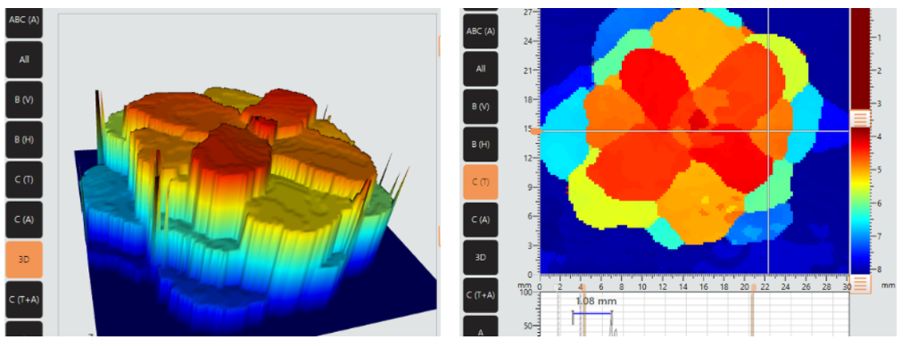 Bu özel projede, 5.0 MHZ'lik bir dönüştürücü ve 8mm'lik bir gecikme hattı, CFRP malzemesi için uygun nüfuz gücü sağlamanın yanı sıra, hasarlı alanı ve etkilenen derinliği, yönlendirilmiş A tarama prosedürü için gerekli olan zamandan çok daha kısa bir sürede belirlemede olağanüstü çözünürlük sunmuştur.